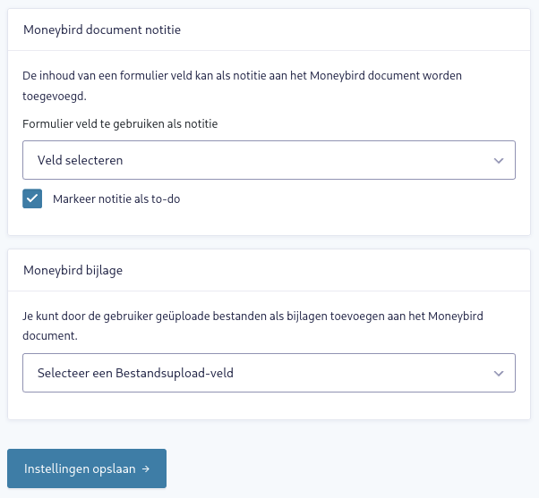 Vanaf versie 2.2.0 van onze Moneybird API plugin voor Gravity Forms is het mogelijk om automatisch notities en door de gebruiker geuploade bestanden als bijlage bij de Moneybird factuur of offerte op te slaan. De extra instellingen zien er als volgt uit: