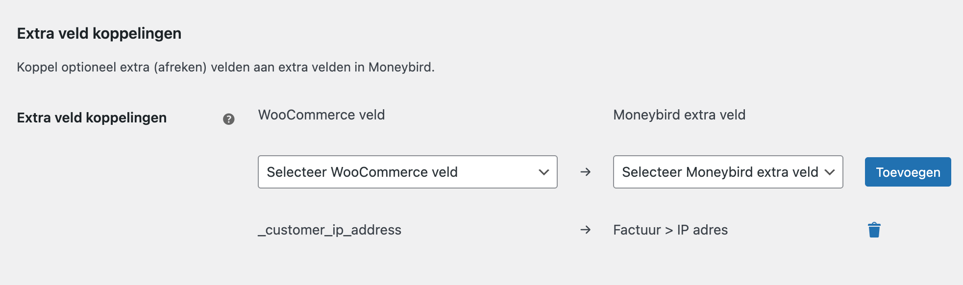 Koppel Extra velden aan WooCommerce data om dynamisch extra informatie toe te voegen aan facturen, offertes of contacten.